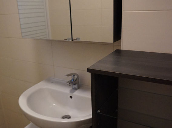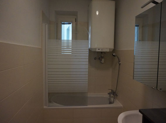 Das Badezimmer verfügt über eine Badewanne und einen Waschmaschinenanschluß.